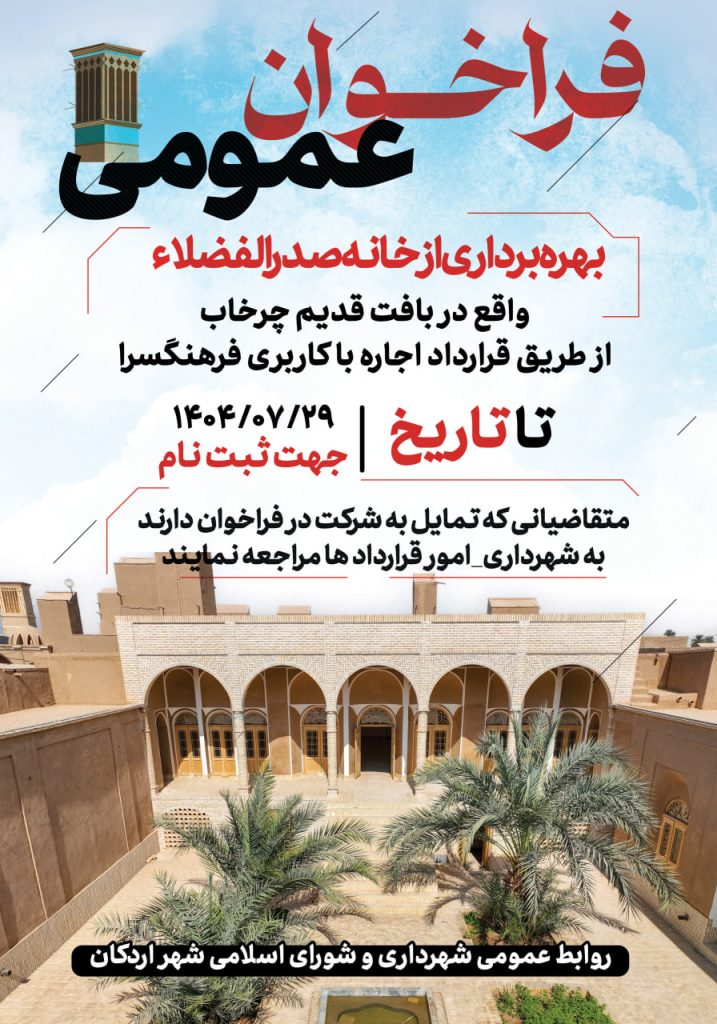 #فراخوان_عمومی ❌ شهرداری اردکان یزد در نظر دارد بهره برداری از خانه صدرالفضلاء واقع در…