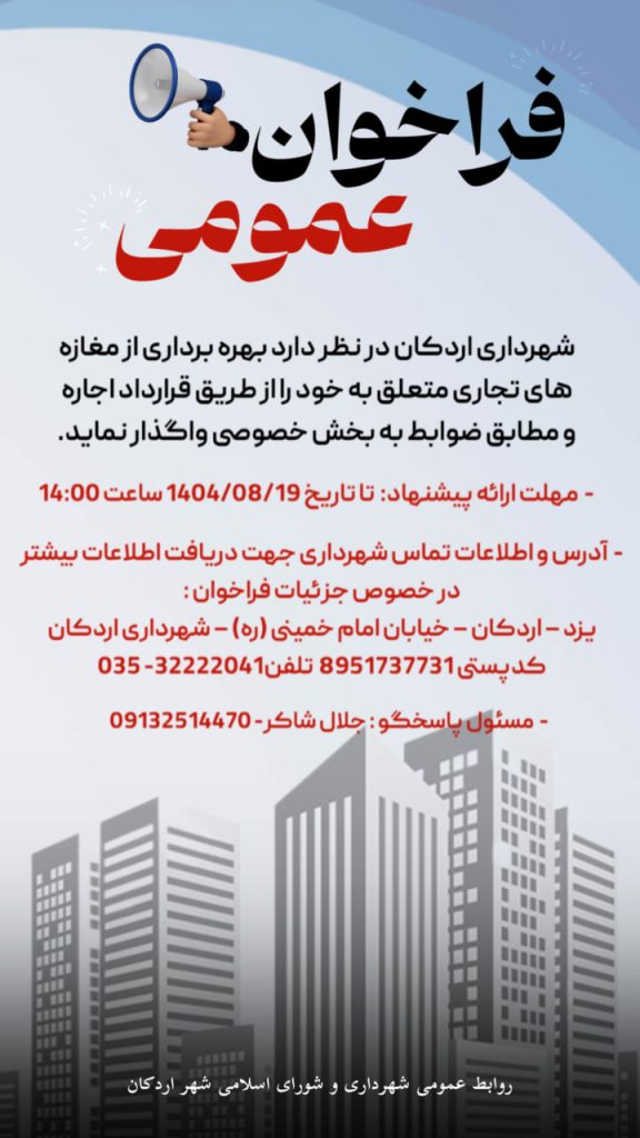📣 فراخوان عمومی ❌شهرداری اردکان در نظر دارد بهره برداری از مغازه های تجاری متعلق…