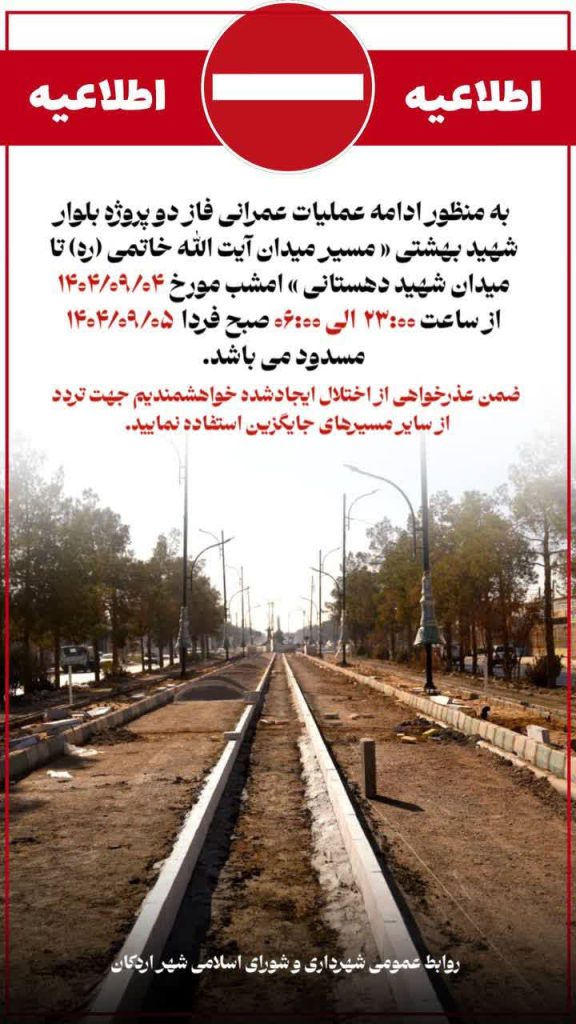 ⚠️ شهروندان گرامی 🔴 به اطلاع میرساند به منظور ادامه عملیات عمرانی فاز دو پروژه…