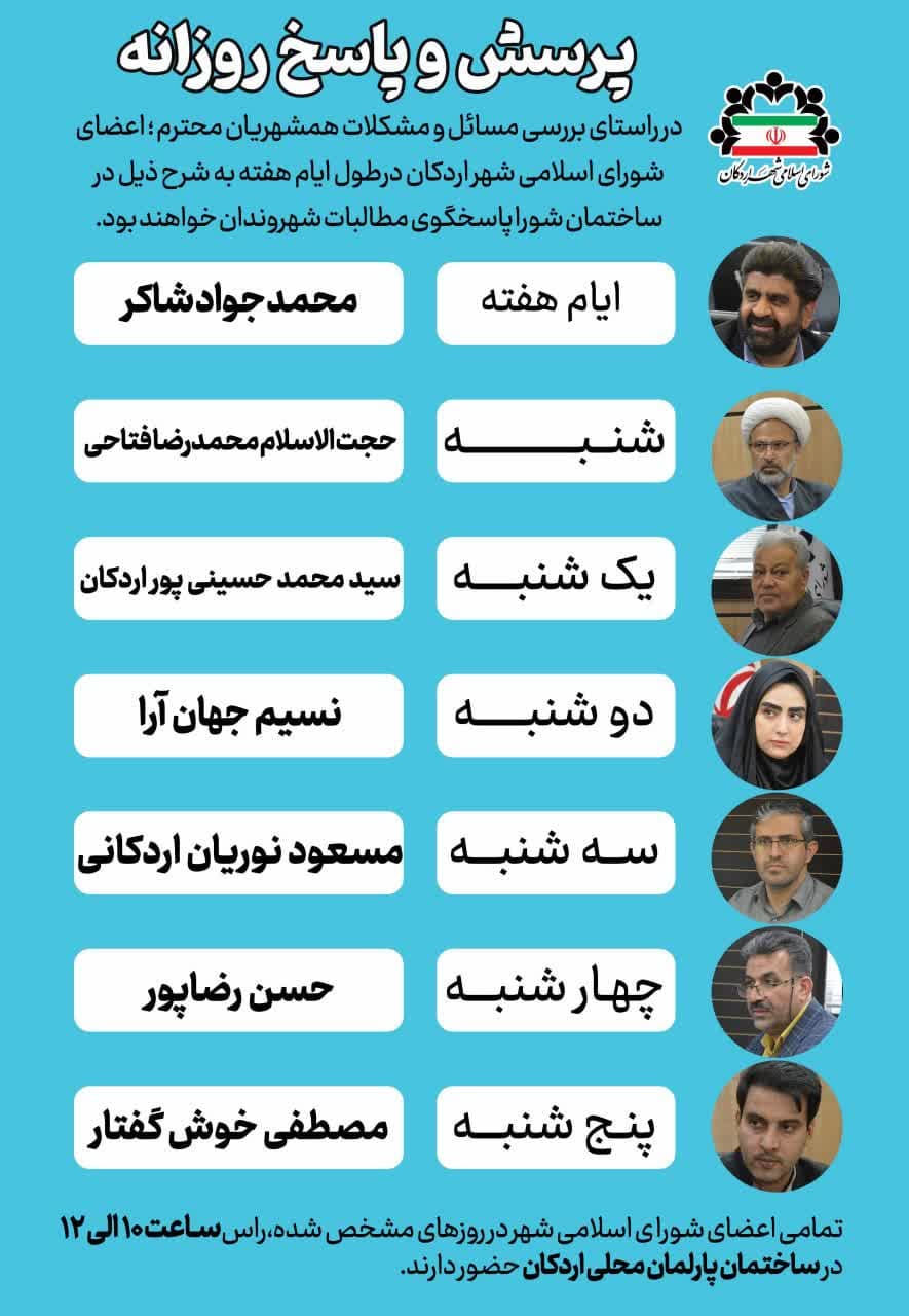 ✅ پرسش و پاسخ روزانه 💠 در راستای بررسی مسائل و مشکلات همشهریان محترم ؛ اعضای شورای اسلامی شهر اردکان درطول ایام هفته در ساختمان