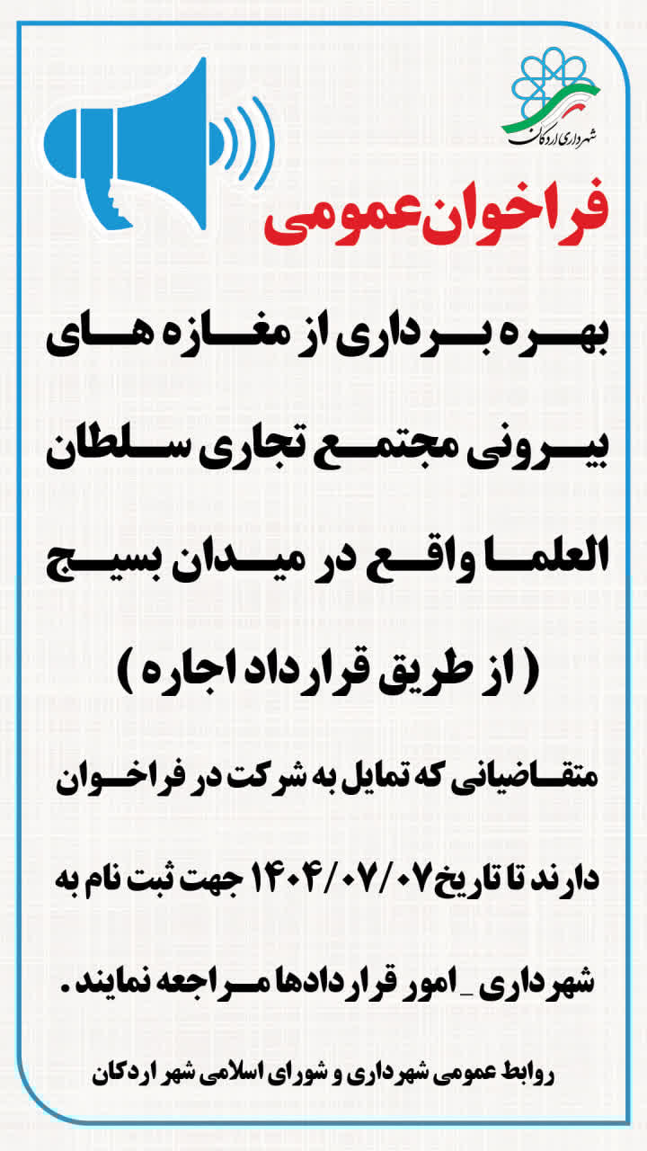 📣 فراخوان عمومی ❌شهرداری اردکان یزد در نظر دارد بهره برداری از مغازه های بیرونی مجتمع تجاری سلطان العلماء واقع در خیابان شهید مصطفی خمینی(ره)-جنب
