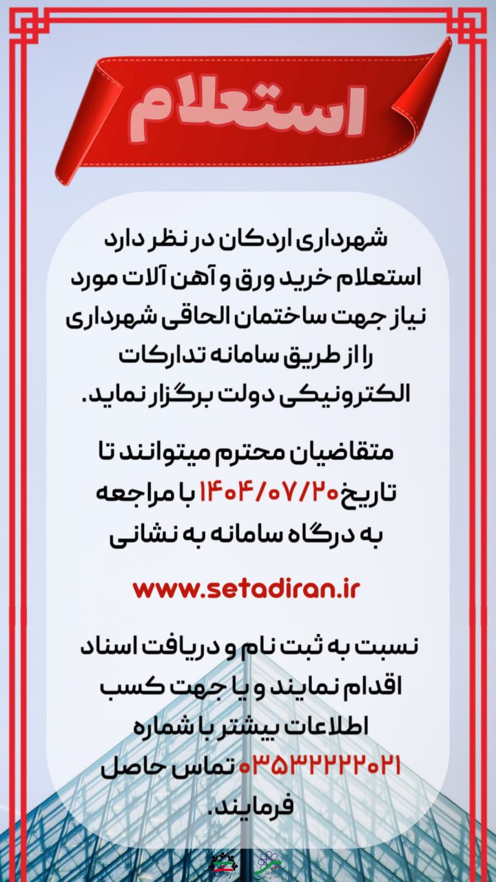 #استعلام_بهاء شهرداری اردکان یزد در نظر دارد استعلام خرید ورق و آهن آلات مورد نیاز جهت ساختمان الحاقی شهرداری به شرح جدول ذیل را از