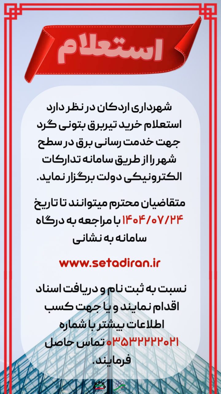 #استعلام_بهاء شهرداری اردکان یزد در نظر دارد استعلام خرید تیر برق بتونی گرد جهت خدمات رسانی برق در سطح شهر به شرح جدول ذیل را