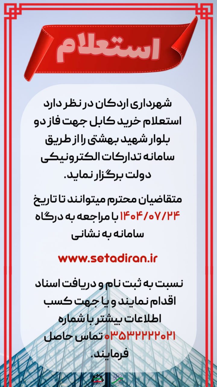 #استعلام_بهاء شهرداری اردکان یزد در نظر دارد استعلام خرید کابل جهت فاز ۲ بلوار شهید بهشتی به شرح جدول ذیل را از طریق سامانه تدارکات