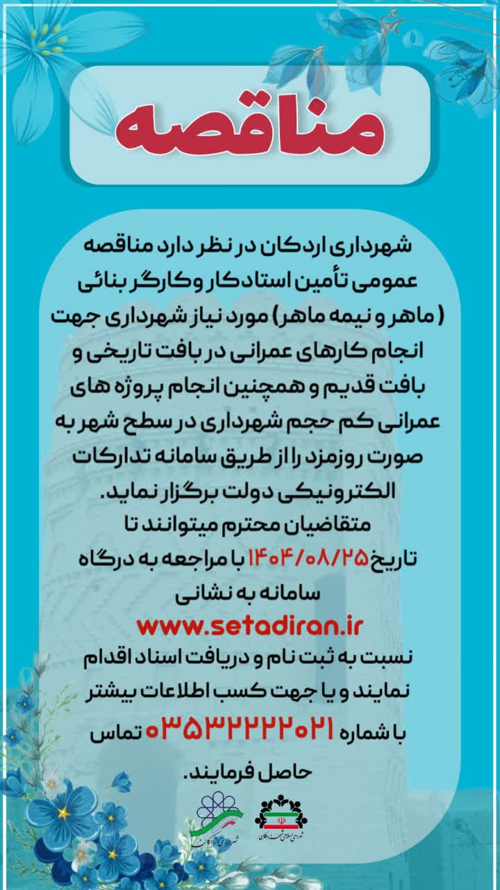 #آگهی_مناقصه_عمومی شهرداری اردکان یزد در نظر دارد مناقصه عمومی تامين استاد کار و کارگر بنائي (ماهر و نیمه ماهر) مورد نیاز شهرداری جهت انجام کارهای