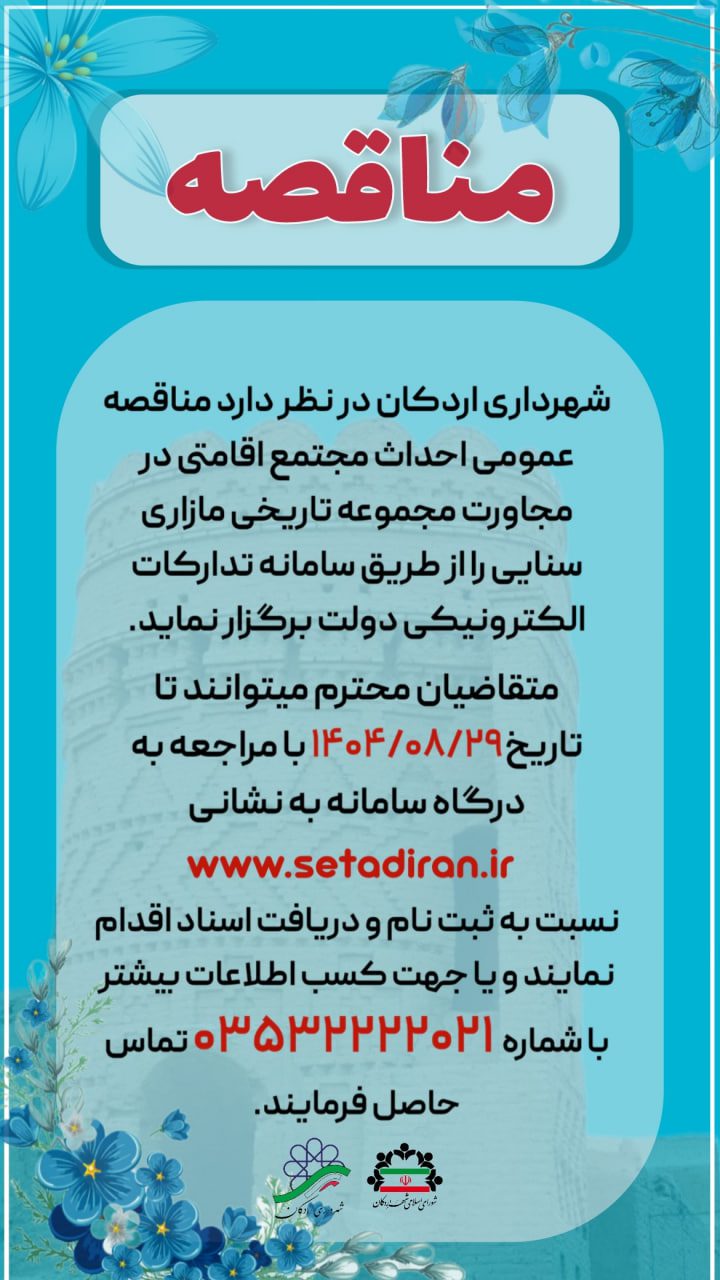 #آگهی_مناقصه_عمومی شهرداری اردکان یزد در نظر دارد مناقصه عمومی احداث مجتمع اقامتی در مجاورت مجموعه تاریخی مازاری سنایی را از طریق سامانه تدارکات الکترونیکی دولت