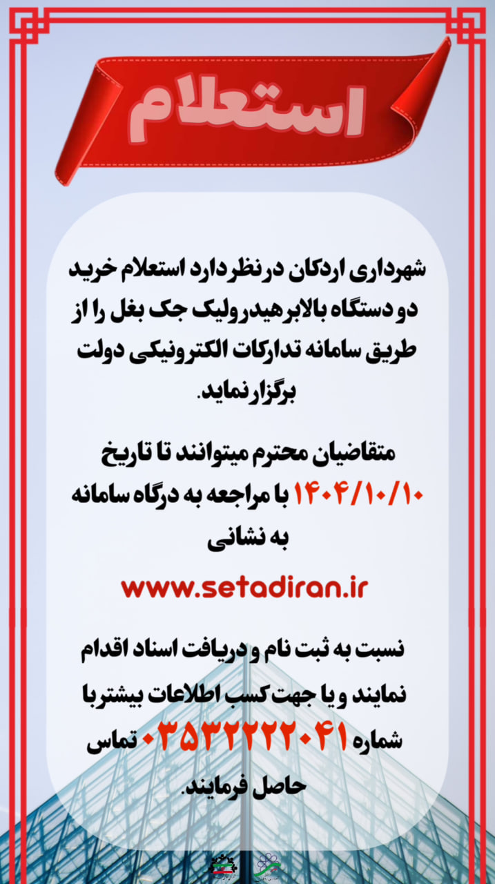 #استعلام_بهاء شهرداری اردکان یزد در نظر دارد استعلام خرید دو دستگاه بالابر هیدرولیک جک بغل به شرح جدول ذیل را از طریق سامانه تدارکات الکترونیکی