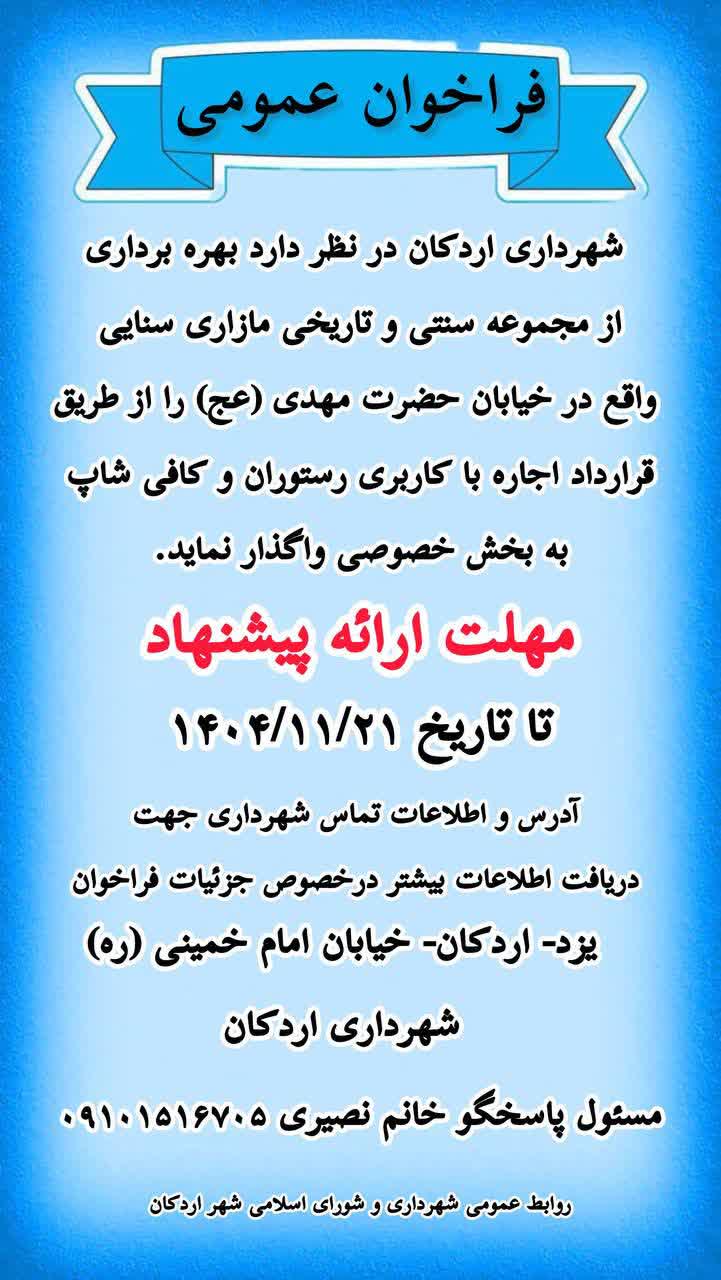 #فراخوان_عمومی شهرداری اردکان یزد در نظر دارد بهره برداری از مجموعه سنتی و تاریخی مازاری سنایی واقع در خیابان حضرت مهدی(عج) از طریق قرارداد اجاره