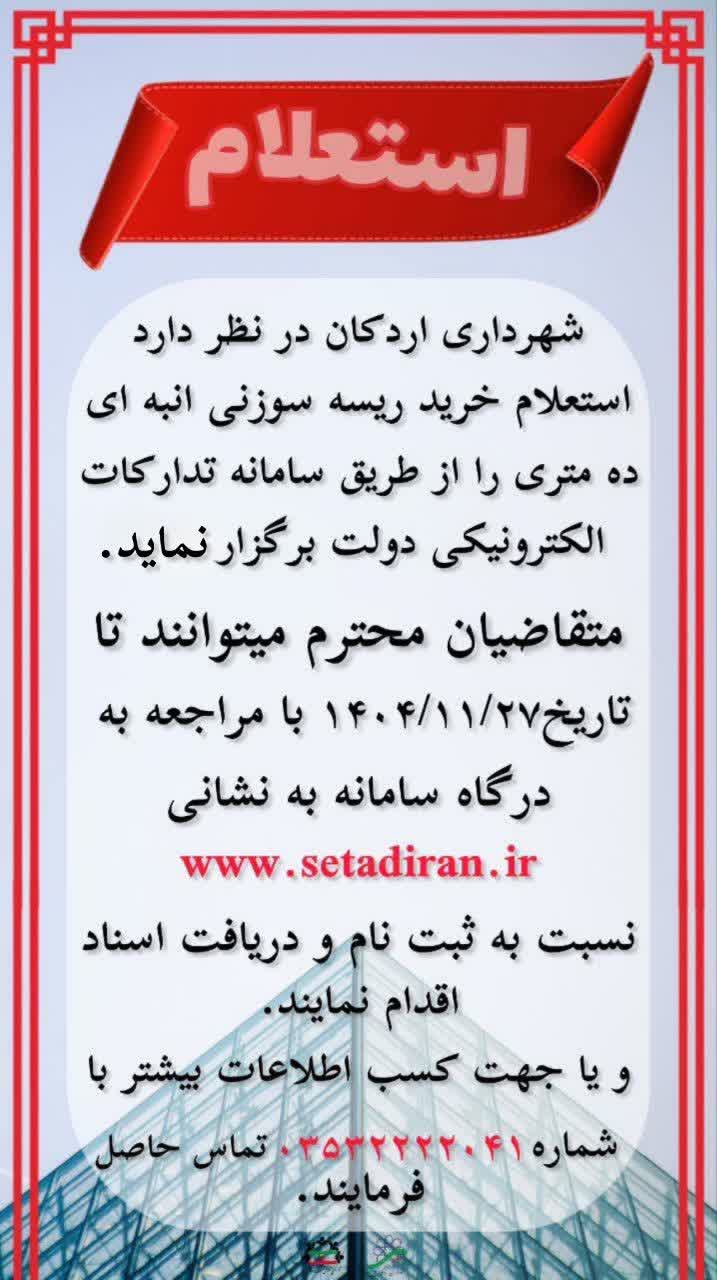 #استعلام_بهاء شهرداری اردکان یزد در نظر دارد استعلام خرید ریسه سوزنی انبه ای ده متری به شرح جدول ذیل را از طریق سامانه تدارکات الکترونیکی