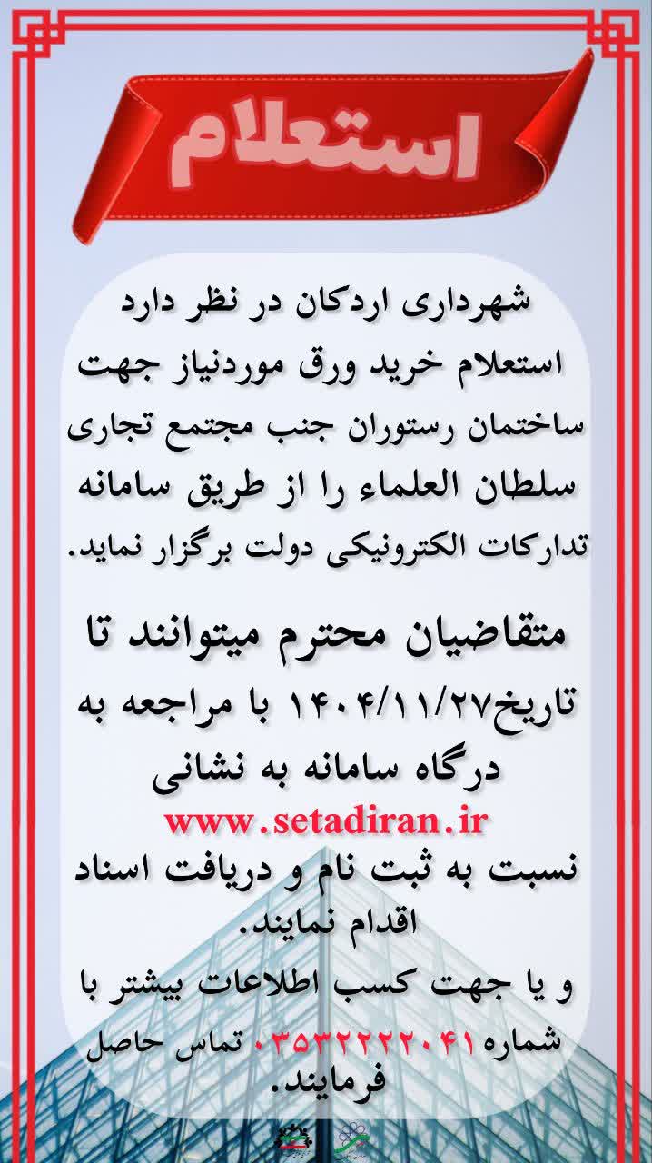 #استعلام_بهاء شهرداری اردکان یزد در نظر دارد استعلام خرید ورق مورد نیاز به شرح جدول ذیل جهت ساختمان رستوران جنب مجتمع تجاری سلطان العلماء را