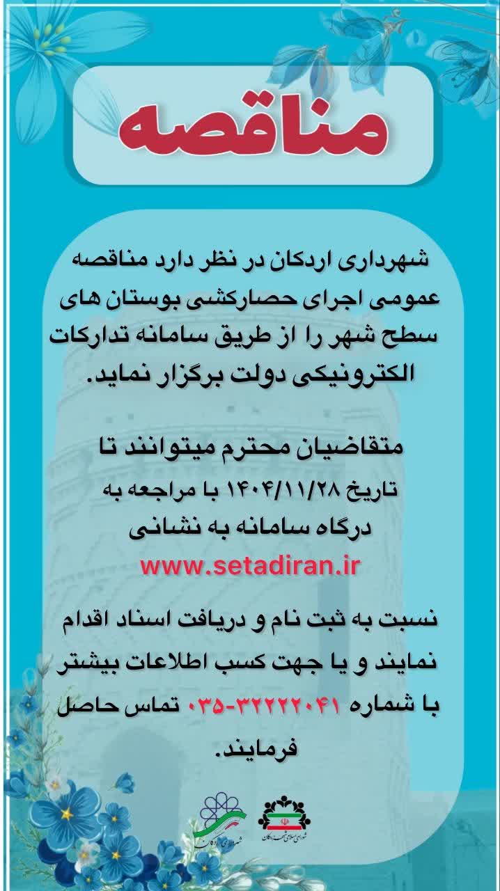 #آگهی_مناقصه_عمومی شهرداری اردکان یزد در نظر دارد مناقصه عمومی اجرای حصارکشی بوستان های سطح شهر به شرح ذیل را از طریق سامانه تدارکات الکترونیکی دولت