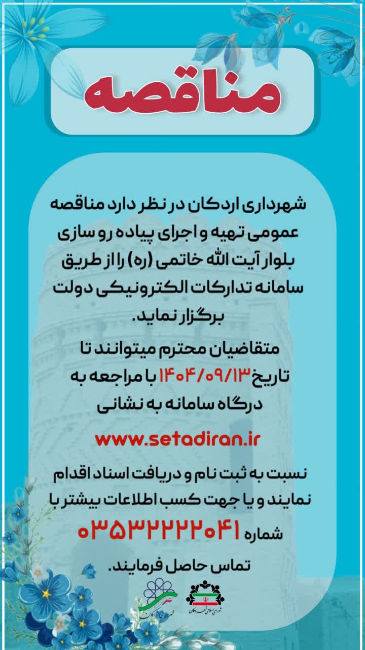 #آگهی_مناقصه_عمومی شهرداری اردکان یزد در نظر دارد مناقصه عمومی تهیه و اجرای پیاده رو سازی بلوار آیت الله خاتمی (ره) به شرح ذیل را از