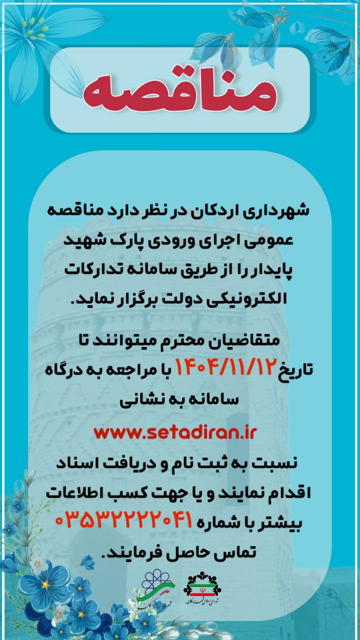 #آگهی_مناقصه_عمومی شهرداری اردکان یزد در نظر دارد مناقصه عمومی اجرای ورودی پارک شهید پایدار به شرح ذیل را از طریق سامانه تدارکات الکترونیکی دولت (